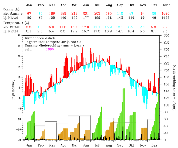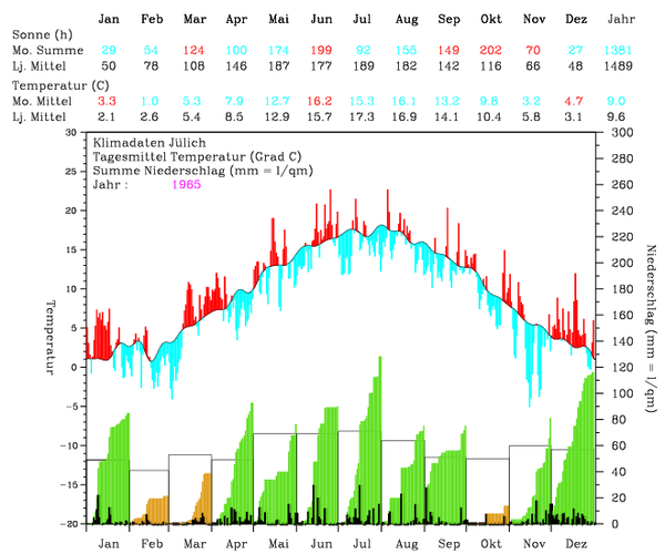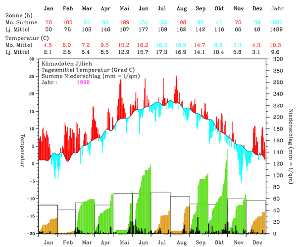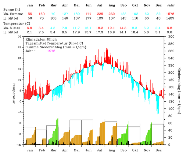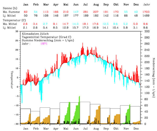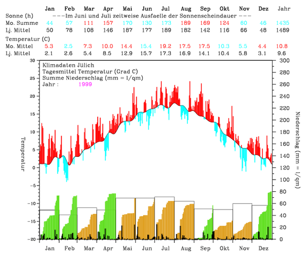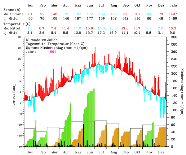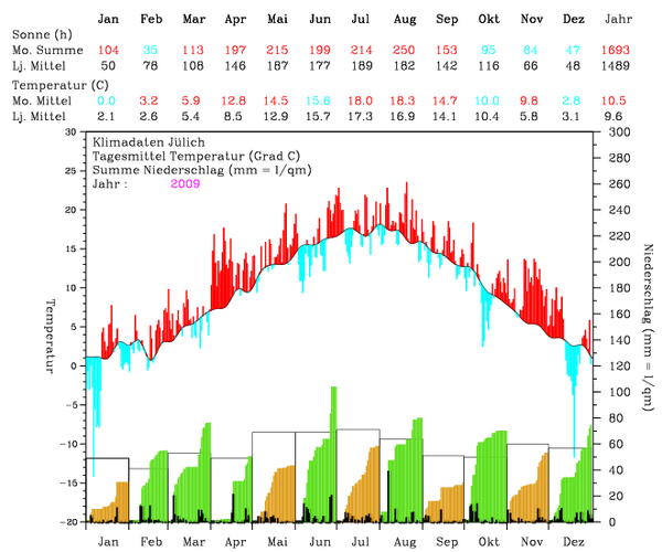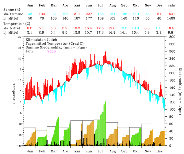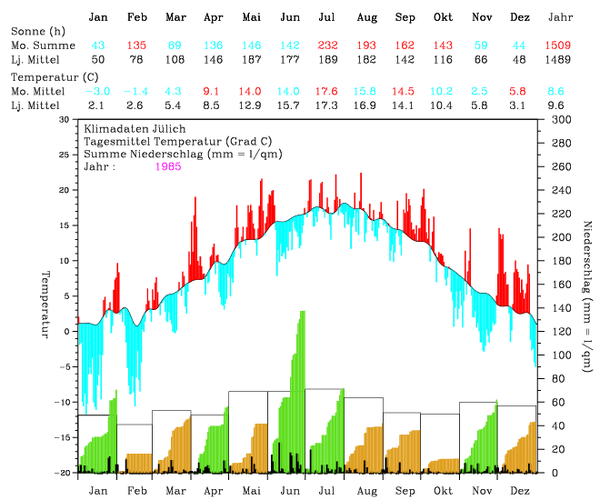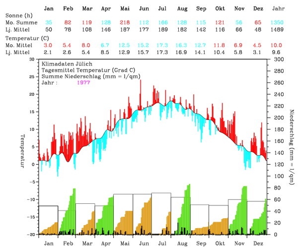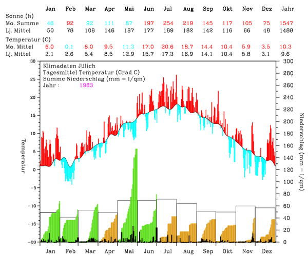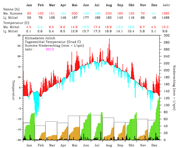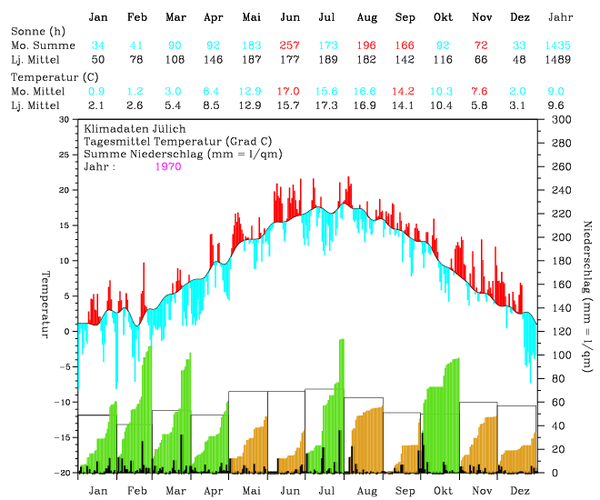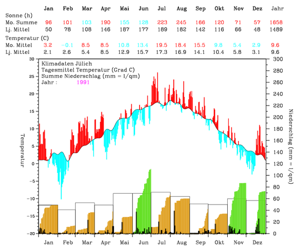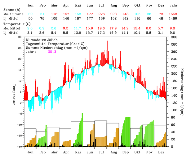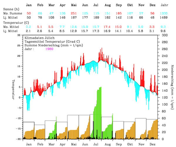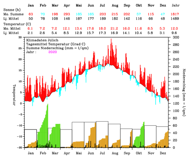 Die Meteogramme zeigen in einem Bild die wesentlichen Klimagrößen eines Jahres an der Klimastation des Forschungszentrums Jülich. Sie enthalten die Temperaturabweichungen vom langjährigen Mittelwert sowie die monatlichen Niederschlagssummen im Vergleich zu den langjährigen Mittelwerten der Monatsniederschläge. Darüber hinaus ergänzen zwei Tabellen die grafische Darstellung. Sie enthalten die monatlichen Mitteltemperaturen sowie die Sonnenscheinstunden im Vergleich zu den langjährigen Monatsmitteln. Für den Vergleich dienen die Mittelwerte der Klimanormalperiode im Zeitraum von 1961 - 1990.