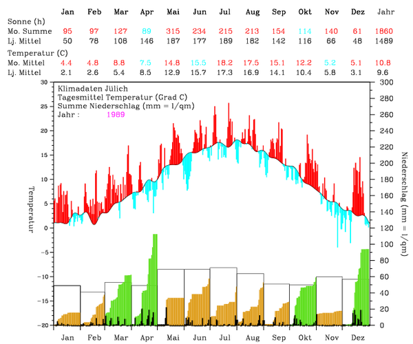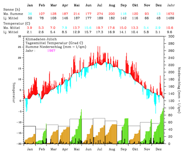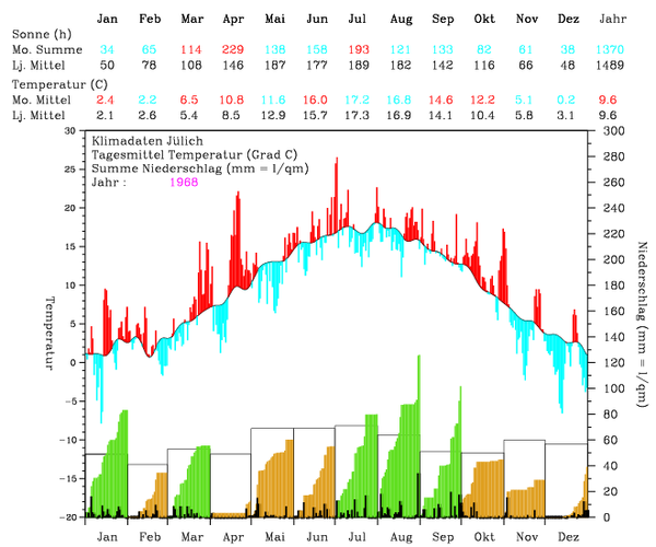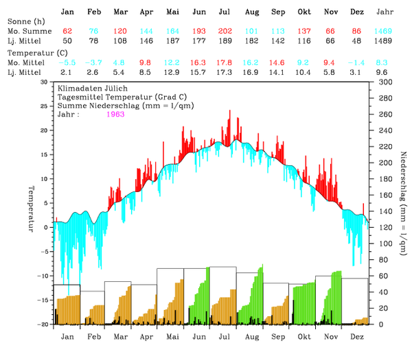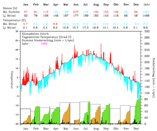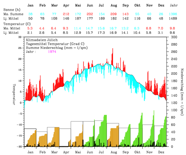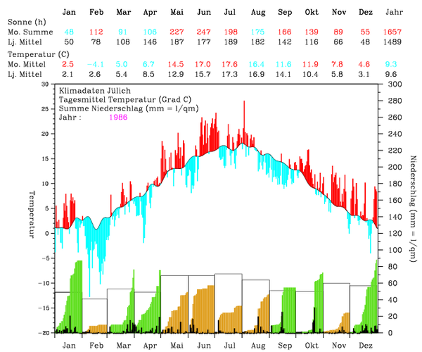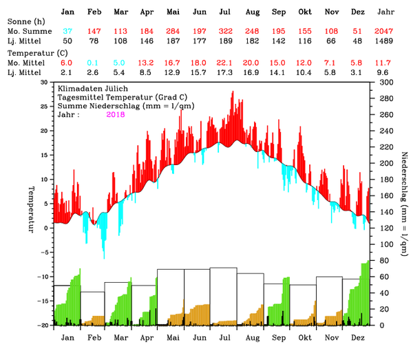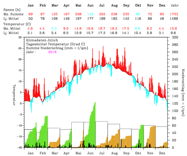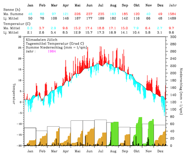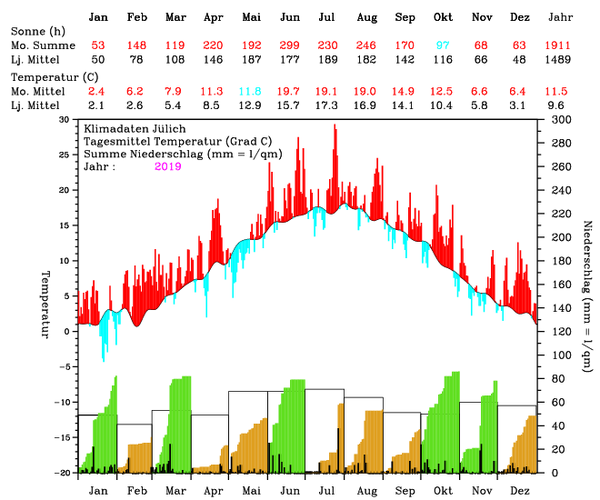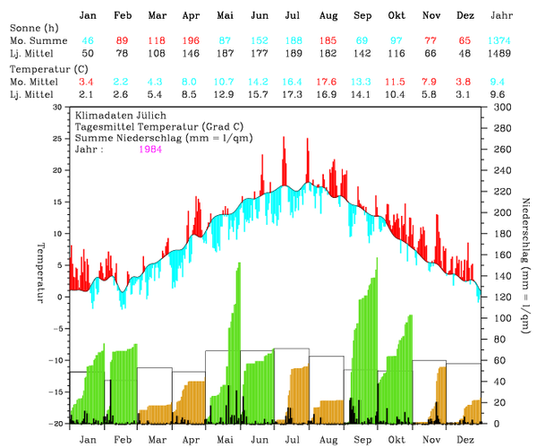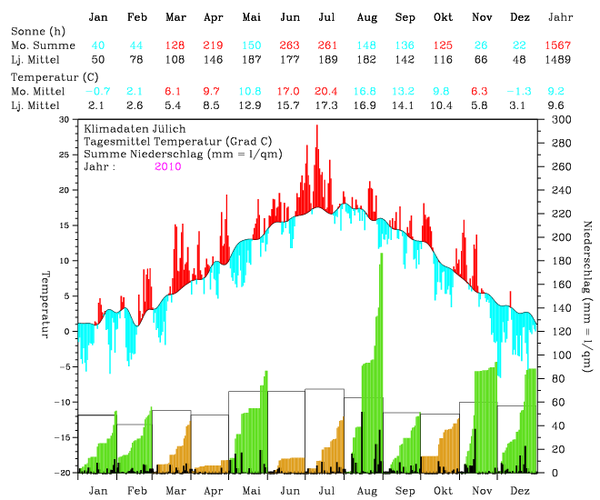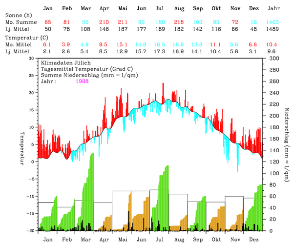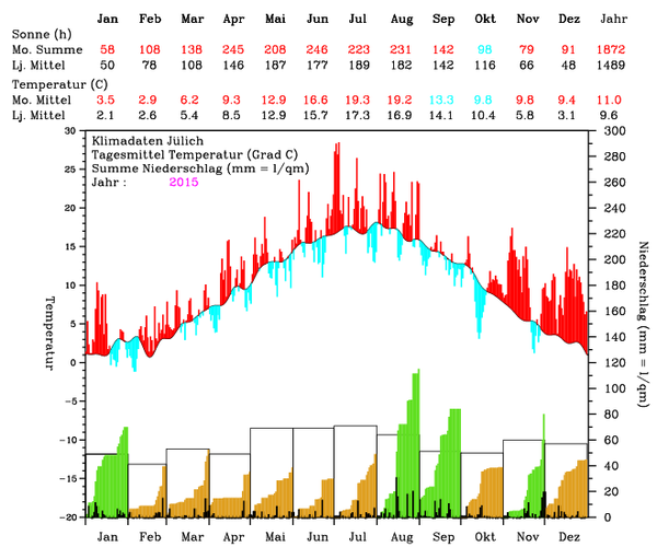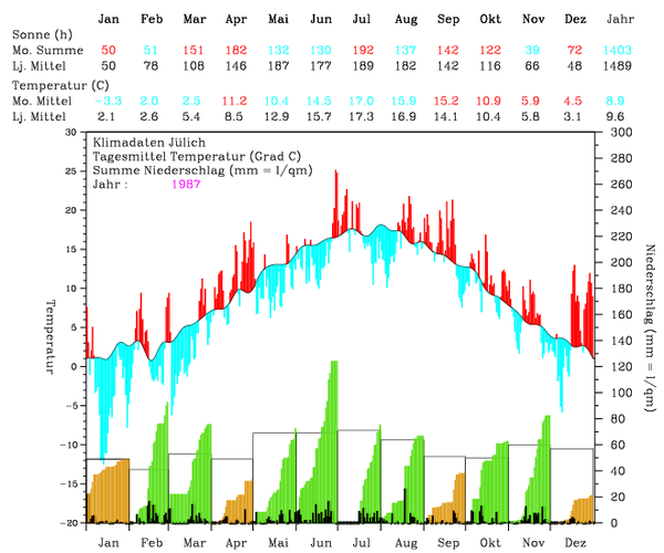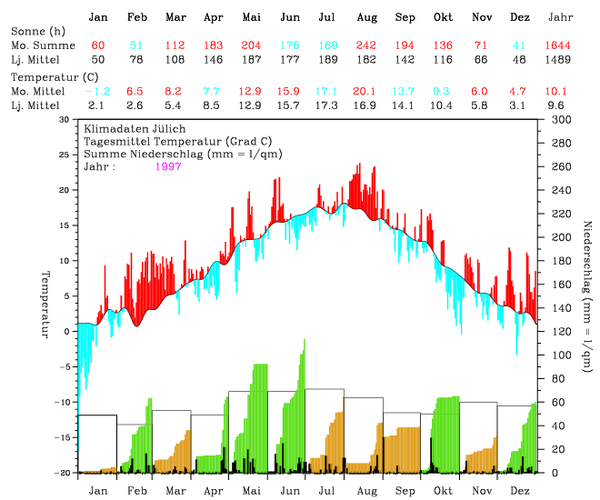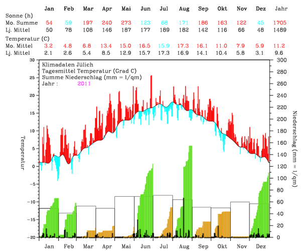 Die Meteogramme zeigen in einem Bild die wesentlichen Klimagrößen eines Jahres an der Klimastation des Forschungszentrums Jülich. Sie enthalten die Temperaturabweichungen vom langjährigen Mittelwert sowie die monatlichen Niederschlagssummen im Vergleich zu den langjährigen Mittelwerten der Monatsniederschläge. Darüber hinaus ergänzen zwei Tabellen die grafische Darstellung. Sie enthalten die monatlichen Mitteltemperaturen sowie die Sonnenscheinstunden im Vergleich zu den langjährigen Monatsmitteln. Für den Vergleich dienen die Mittelwerte der Klimanormalperiode im Zeitraum von 1961 - 1990.
