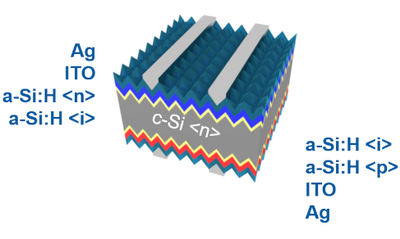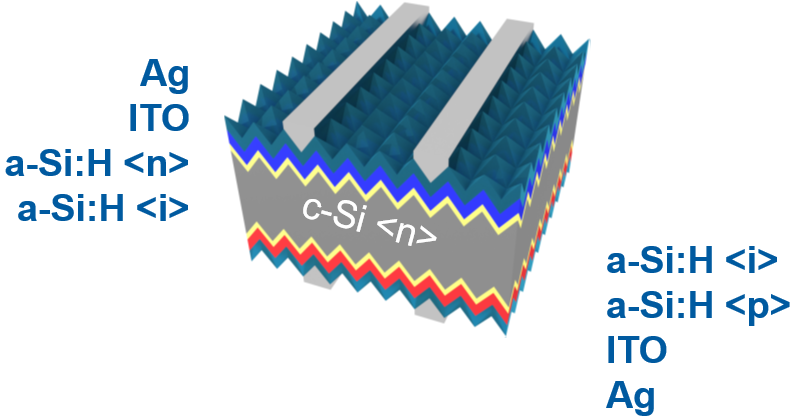 Die Silizium-Heterojunction-Solarzelle (SHJ) stellt eine neue Generation von Silizium-Wafer-Solarzellen dar, mit der hohe Wirkungsgrade erzielt werden können. Ein Querschnittsaufbau einer SHJ-Solarzelle ist in Abb. 1 dargestellt. Das IMD-3 befasst sich mit der Material-, Prozess-, Zell-, Modul- und Systementwicklung für die SHJ-Solarzelle und deren Anwendungen, was die gesamte Wertschöpfungskette der SHJ-Technologie abdeckt. Die Zelltechnologie reicht von der nasschemischen Vorbehandlung der kristallinen Siliziumwafer über die Abscheidung funktionaler Dünnschichten mit verschiedenen Abscheideverfahren bis hin zur thermischen Endbehandlung nach der Abscheidung.