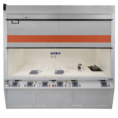 Im ersten Prozessschritt wird auf einer Nassbank von Arias gearbeitet (Abb. 3). Die Nassbank verfügt über fünf Prozessbecken und zwei Spülbecken, in denen verschiedene Arbeitsschritte wie Sägeschadenentfernung, Texturierung, Ozonreinigung, Oxidation, Entfernung des Oxids und Spülung mittels Quick Dump Rinse durchgeführt werden können. Die Becken können jeweils einen Halter mit 25 M2-Wafern aufnehmen. Da die Arbeit bzw. der Transport zwischen den Prozessschritten partikelkritisch ist, findet er in einem Ionstatex-Reinraum der Klasse 5 oder besser statt (Abb. 4).