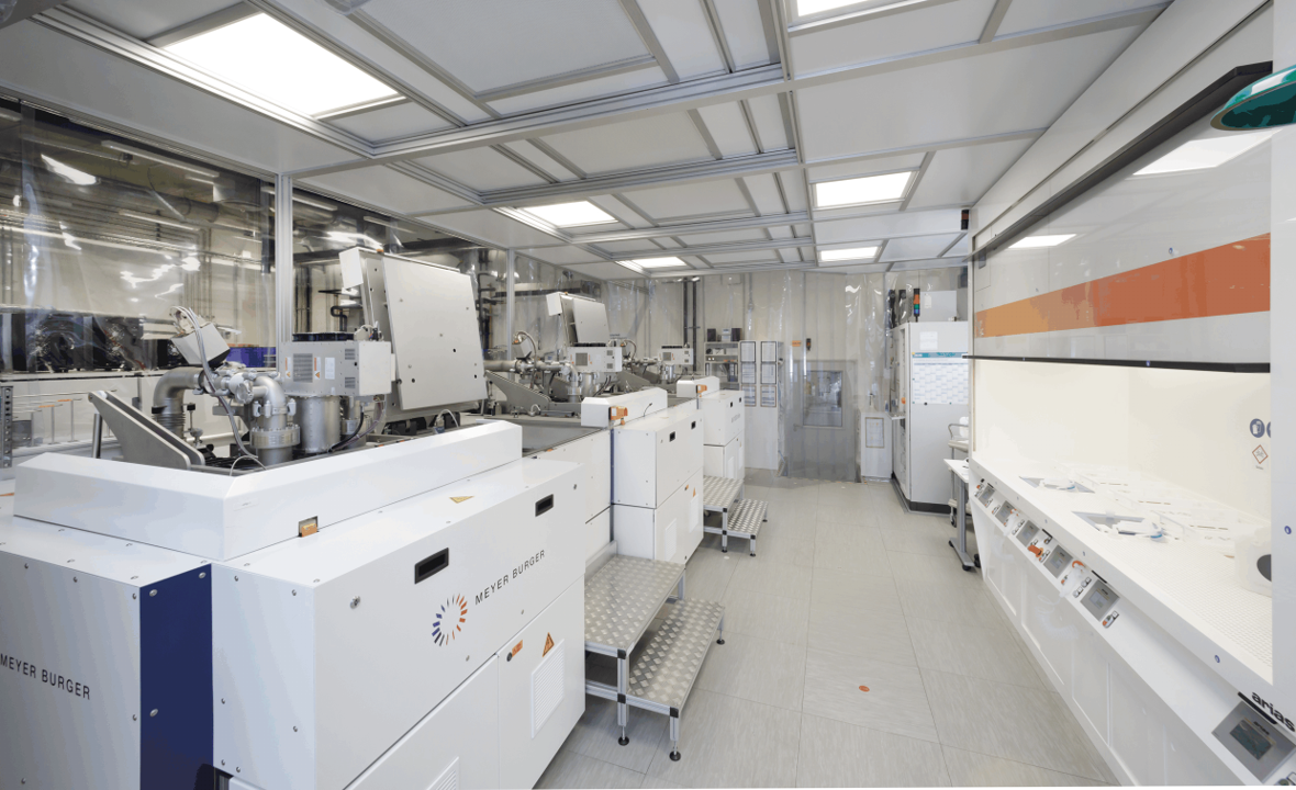 Das IMD-3 betreibt eine Baseline, die die gesamte Prozesstechnik für die industrielle Produktion von hocheffizienten SHJ-Solarzellen auf M2-Wafergröße abdeckt: von der nasschemischen Vorbehandlung über die Dünnschichtabscheidung bis zur Metallisierung. Darüber hinaus stehen verschiedene Messeinrichtungen zur Charakterisierung der fertigen Solarzellen und der jeweiligen Schichten zur Verfügung.