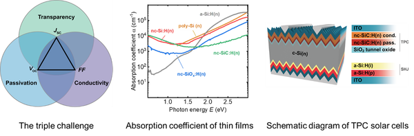 Die klassischen dreifachen Anforderungen an die Frontkontakte von kristallinen Silizium-Solarzellen (c-Si) - hohe Leitfähigkeit, hervorragende Oberflächenpassivierung und hohe optische Transparenz - stehen oft im Widerspruch zueinander und erfordern Kompromisse. Beispielsweise ermöglicht die Trennung der Metallkontakte vom c-Si-Absorber mit verschiedenen Arten von passivierenden Frontkontakten eine hervorragende Oberflächenpassivierung und entsprechend hohe Leerlaufspannungen (Voc), aber die Solarzellen leiden oft unter einer erheblichen parasitären Lichtabsorption in den amorphen oder polykristallinen Siliziumkontaktschichten, was zu einer erheblichen Verringerung der Kurzschlussstromdichte (Jsc) führt.