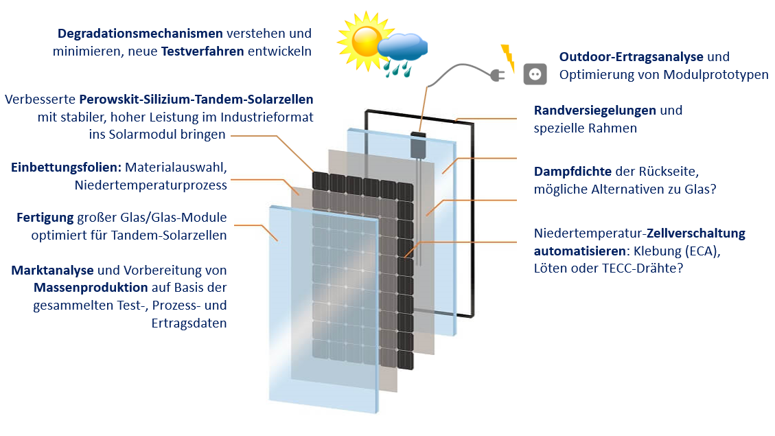 Solarmodule mit Tandemsolarzellen werden als die nächste Generation von Solarmodulen gesehen, da mit ihnen deutlich höhere Wirkungsgrade als mit heutigen Solarmodulen erreicht werden können. Diese Technologie wird zudem für den Wiedereinstieg Deutschlands in die Herstellung von Solarmodulen entscheidend sein. Große Chancen werden dabei Modulen aus sogenannten monolithischen Perowskit-Silizium-Tandemsolarzellen zugeschrieben, da diese den jetzigen Standardsolarzellen im Aufbau sehr ähnlich sind und das Zellkonzept auf der heutigen Silizium-Zelltechnologie basiert. Allerdings sind diese Perowskit-Silizium-Tandemsolarzellen sehr temperaturempfindlich. Daher sind Entwicklungsarbeiten an den Tandemzellen selbst wie auch an der Modulintegration, der Verschaltung und Verkapselung und die Senkung der Prozesstemperaturen nötig.