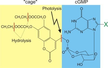 Figure 3: Caged cGMP - a Trojan horse. The uncharged ester side chains of the "cage" are hydrolyzed once the compound arrives inside the cell. The now charged compound cannot leave the cell anymore: it is trapped inside the cell. However, due to its "cage", cGMP is invisible to the cell. Only upon irradiation with a short flash of UV light (photolysis), the molecule is released in its free, active form. X denotes a potential substitution site: for example, 8-Br-cGMP is a hydrolysis-resistant derivative of higher biological efficacy than cGMP.