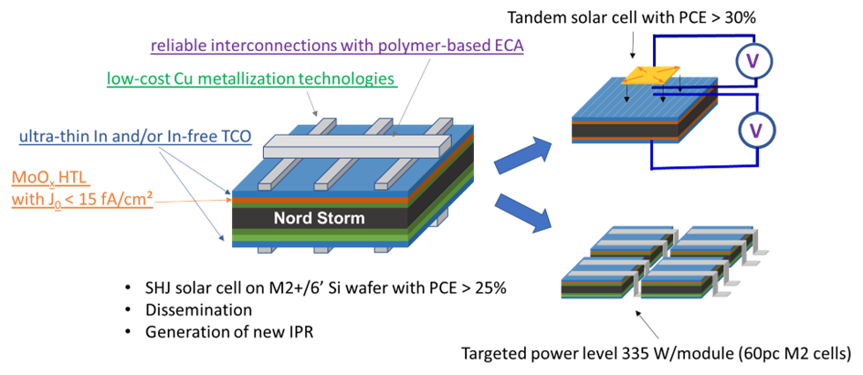 The NORDSTORM project is working with partners to develop the next generation of silicon heterojunction (SHJ) solar cells and module technologies that can achieve power conversion efficiencies (PCE) of over 30% in the 4-terminal perovskite/silicon (4T PK/Si) tandem structure. The main project goals are: