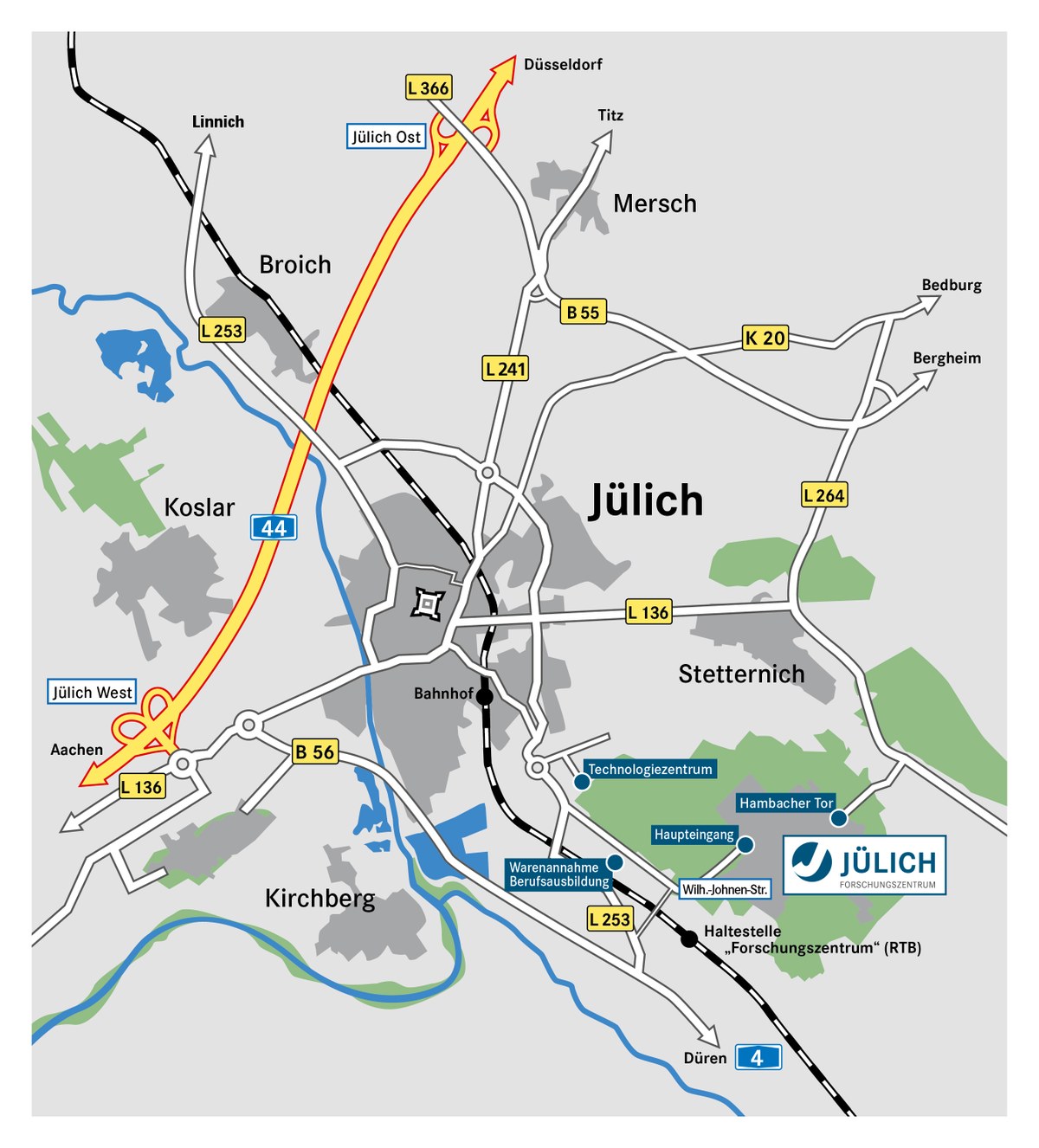 Coming from Aachen take the A 44 motorway (Aachen – Düsseldorf) and leave the motorway at the Jülich-West exit. At the first roundabout turn left towards Jülich, and at the second roundabout turn right towards Düren (B 56). After about 5 km, turn left onto the L 253 and follow the signs to "Forschungszentrum".