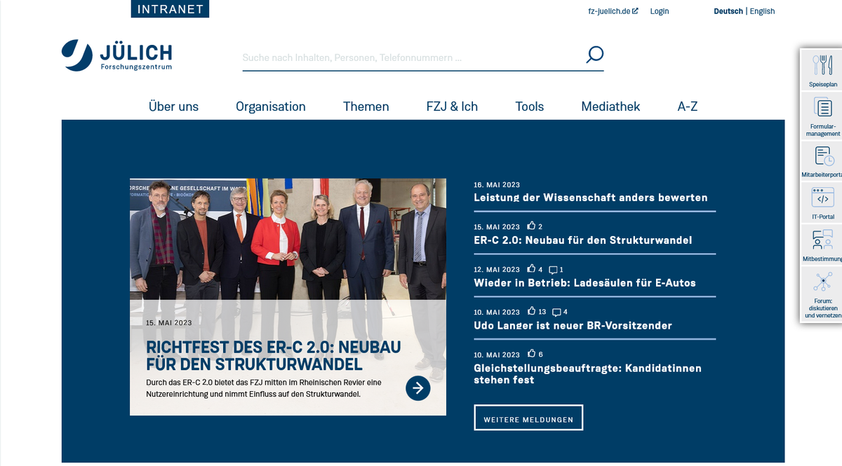 The intranet, the internal communication platform of Forschungszentrum Jülich, is a service exclusively for the staff of Forschungszentrum Jülich. To access the platform, you need access to the FZJ network. Therefore, before you click on the following button, make sure that you have a functioning VPN connection or that you are in the internal FZJ network.