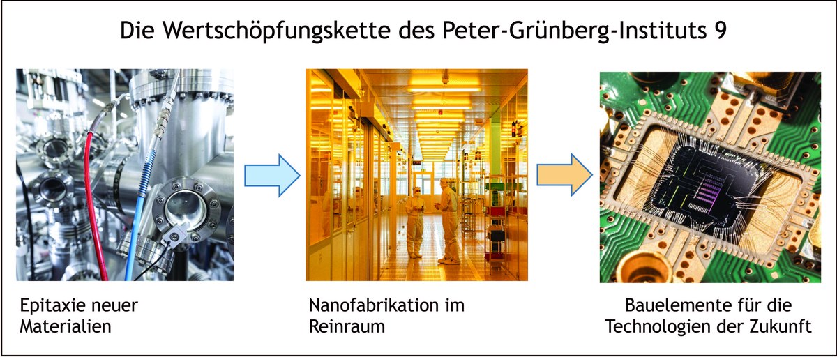 At PGI-9, we operate a unique epitaxy area. From the materials produced there, we manufacture novel devices in our clean room, which find application in quantum technologies and neuromorphic computing, among others.
