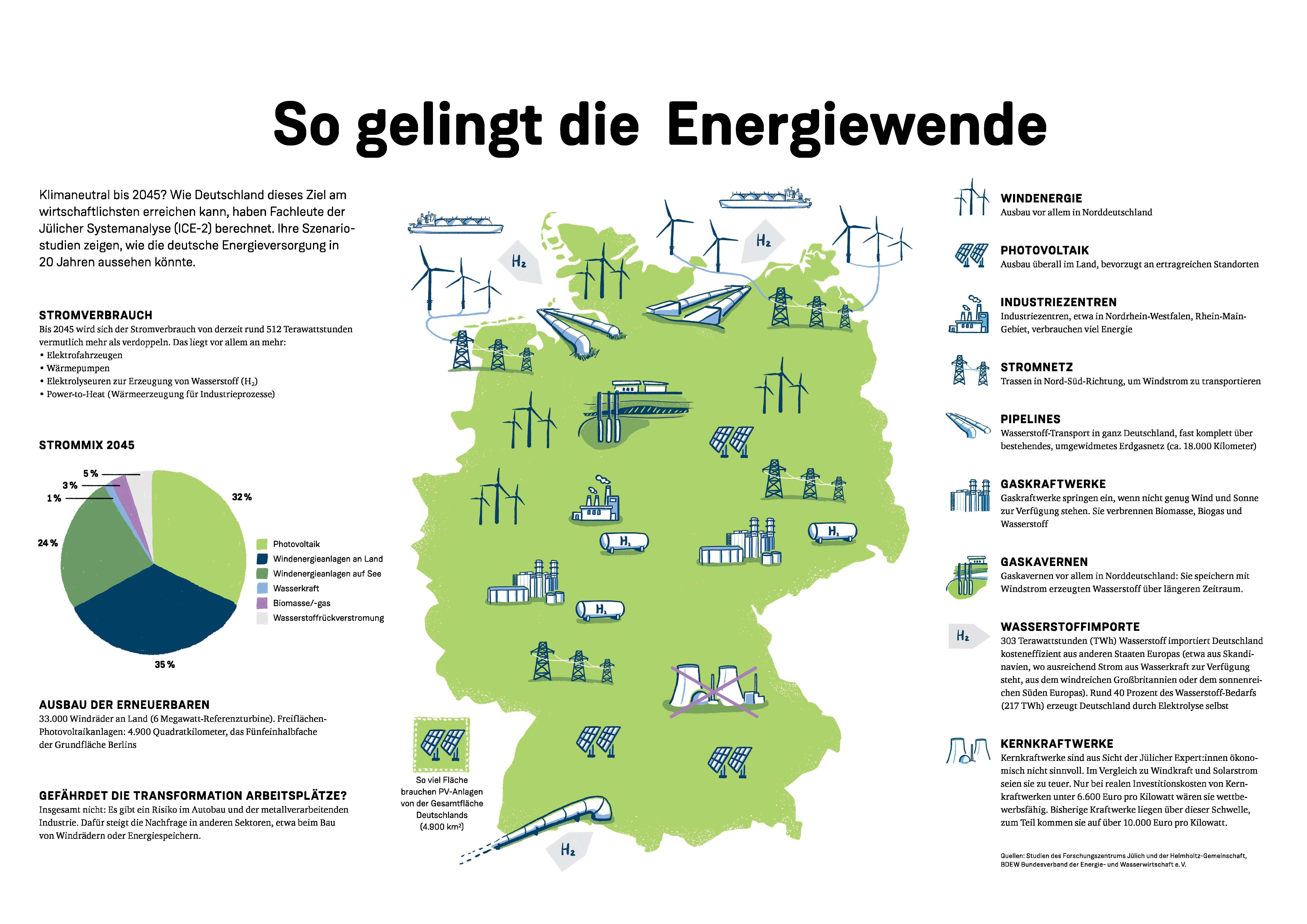 Jülicher Forscher:innen nutzen die Szenariotechnik, um einen Blick in die Zukunft der deutschen Energieversorgung zu werfen. Die Bundesrepublik hat sich ein ambitioniertes Ziel gesetzt: Bis zum Jahr 2045 soll das Land treibhausgasneutral werden, also unterm Strich keine Treibhausgase mehr ausstoßen. So sieht es das im Jahr 2019 verabschiedete Klimaschutzgesetz vor. Doch ist das zu schaffen? Oder droht die Energiewende auf halbem Weg zu versanden? „Unsere Szenariostudien zeigen: Wir können diese Transformation schaffen – sowohl technisch als auch wirtschaftlich“, sagt Dr. Theresa Klütz von der Jülicher Systemanalyse (ICE-2).