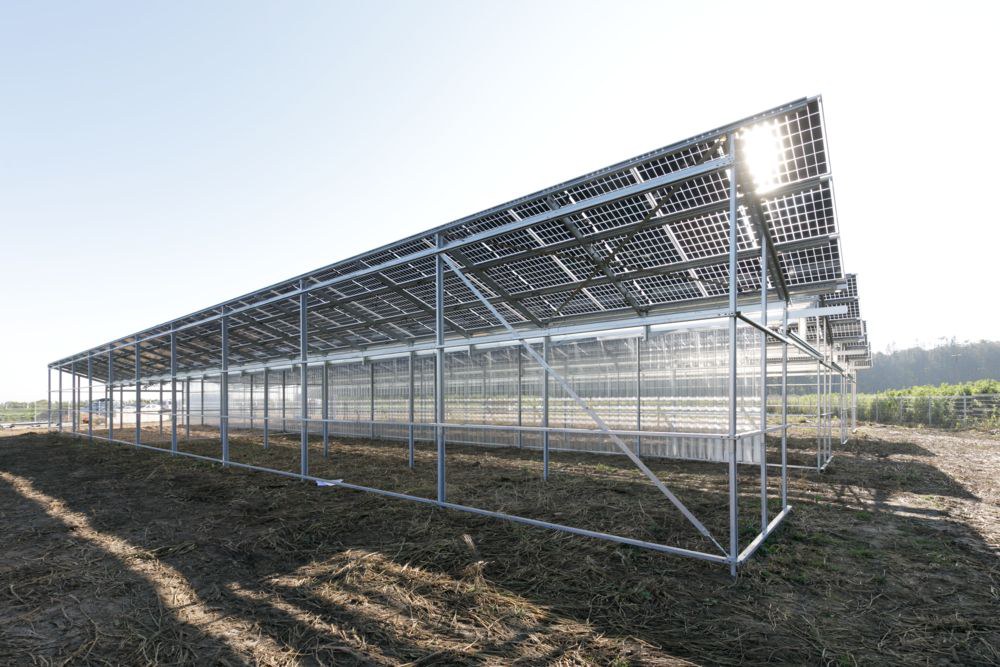 Bei der dritten Variante handelt es sich um aufgeständerte Anlagen: Die PV-Module werden dabei auf einer Pergola-ähnlichen Konstruktion angebracht. Darunter kann die landwirtschaftliche Nutzung der Fläche erhalten bleiben. Die Anlagen sind können so installiert werden, dass darunter Traktoren oder sogar Mähdrescher fahren können. Für den Anbau unter den Solaranlagen eignen sich Schattenpflanzen oder Pflanzen, die regenempfindlich sind.