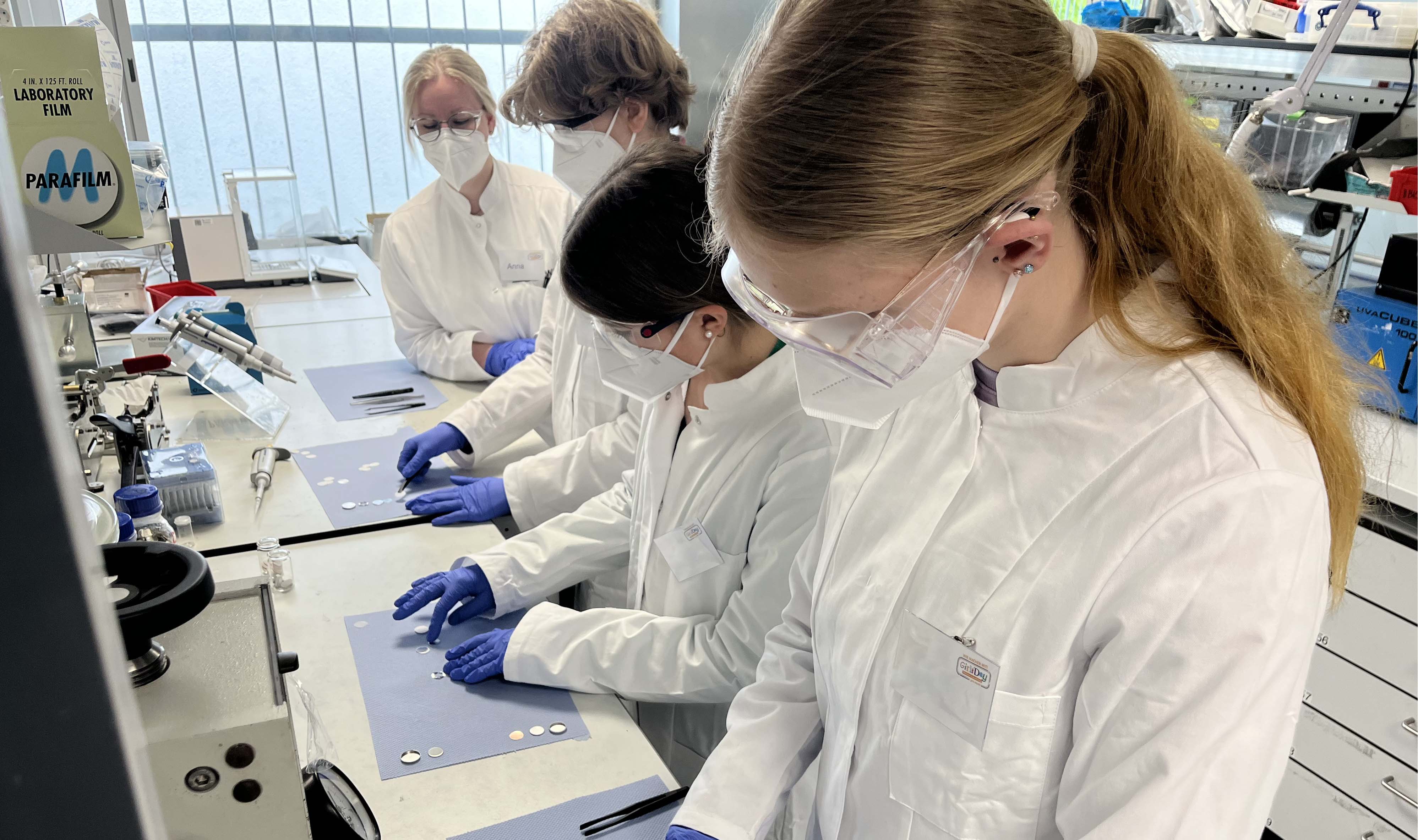 MEET-Mentorin Dr. Anna Gerlitz zeigt den Schülerinnen im Trockenraum, wie man Knopfzellen baut.Copyright: — MEET Batterieforschungszentrum / Lütteke