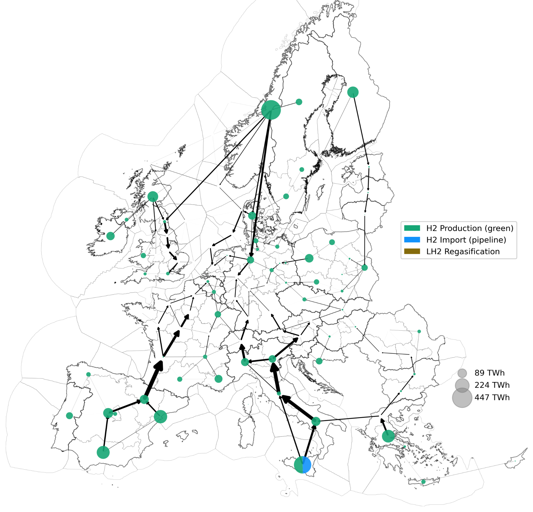 Durch die integrierte, regionale Betrachtung der Strom-, Gas- und Wasserstoffinfrastruktur, einschließlich der Umstellung bestehender Gasnetze und -speicher auf Wasserstoff, wird der Bedarf an Netzausbau auf 800 Gigawatt für Strom und 1800 Gigawatt für Wasserstoff beziffert. Dabei erfolgt der Energietransport verstärkt von Nord- und Südeuropa Richtung Deutschland.