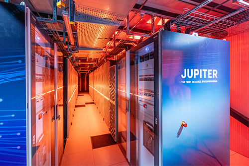 JUPITER wird der erste europäische Exascale-Rechner. Er kann pro Sekunde über eine Trillion Rechenoperationen mit doppelter Genauigkeit ausführen, bei KI Workloads sogar noch deutlich mehr. Damit ist er beispielsweise für die Klimaforschung oder das Training großer KI-Modelle ein herausragendes Werkzeug.