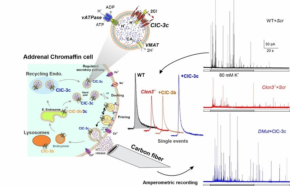 We aim to understand the role of endosomal ion transport for neuronal function, with focus on two endo-lysosomal transporters, ClC-3 and ClC-4, that regulate the pH and [Cl-] in multiple endosomal compartments. A group of neurodevelopmental disorders, in which slight changes in ClC-3 or ClC-4 transport functions cause epilepsy and intellectual disability as well as anxiety, depression, hyperactivity, and bipolar disorders, illustrate the importance of these transporters for higher brain functions. We use transgene technology (genetically modified mouse models and shRNA lentiviral transduction), patch-clamp electrophysiology, membrane cell capacitance measurements, carbon fiber amperometry, photolytic uncaging of intracellular calcium, molecular biology, and confocal microscopy to understand the cellular and molecular function of ClC-3 and ClC-4 in neuronal health and disease and to identify potential strategies for the treatment of CLCN3- and CLCN4-related disorders. Recently, our group efforts clarified the roles of such transporters for the vesicular mono-amine accumulation process and exocytosis and how Cl-/H+ exchangers regulate the electrical and excitability properties of neurons.