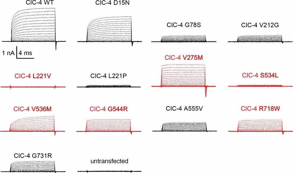 Whole-cell patch-clamp analysis of WT and mutant ClC-4 currents, using transiently transfected HEK293T mammalian cells. (Modified from Front. Mol. Neurosci. https://doi.org/10.3389/fnmol.2022.872407)