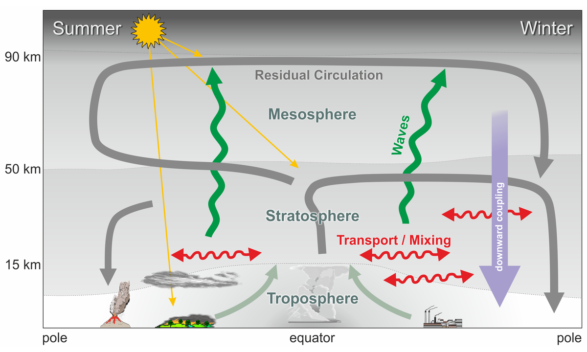 Die globale Stratosphärenzirkulation, die so genannte Brewer-Dobson-Zirkulation (BDC), steuert den Transport von Spurengasen (z. B. Ozon, Wasserdampf), die ihrerseits das Klima durch Strahlungseffekte beeinflussen können. Außerdem können Schwankungen in der Stratosphärenzirkulation das regionale Klima und die Wettermuster beeinflussen. Daher ist für zuverlässige Klimavorhersagen eine genaue Darstellung der stratosphärischen Zirkulation in Atmosphärenmodellen erforderlich. In den Tropen ist die Stratosphärenzirkulation durch den Auftrieb von Luftmassen gekennzeichnet, die verschmutzte Luft aus der Troposphäre tief in die Stratosphäre transportieren können. In der Stratosphäre werden die Luftmassen horizontal in hohe polare Breiten transportiert, wo sie wieder in die Troposphäre absinken. Die BDC ist eine mechanisch erzwungene Zirkulation, deren treibende Kraft atmosphärische Wellen sind (z. B. Rossby-Wellen von planetarischem Ausmaß, kleinräumige Schwerewellen), die sich von der Troposphäre aus nach oben ausbreiten und in den oberen (so genannten „kritischen“) Höhen der Stratosphäre brechen (analog zu den Meereswellen an der Küste). Wenn sie brechen, zerstreuen sich diese Wellen, übertragen ihren Impuls auf die mittlere Strömung und treiben die meridionale Zirkulation der BDC an.