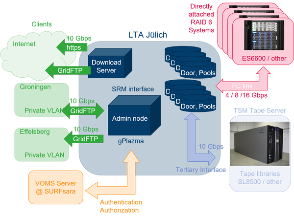 The data collected at the radiotelescope is sent to a central processor in Groningen and then further to the 3 sites in Europe which build together the Long Term Archive (LTA): SURF in the Netherlands, JSC in Germany and PSNC in Poland. At the moment the LOFAR LTA comprises 55 PB of data, about one third of it in the LTA at Jülich, with a growth of 2 PB per year.