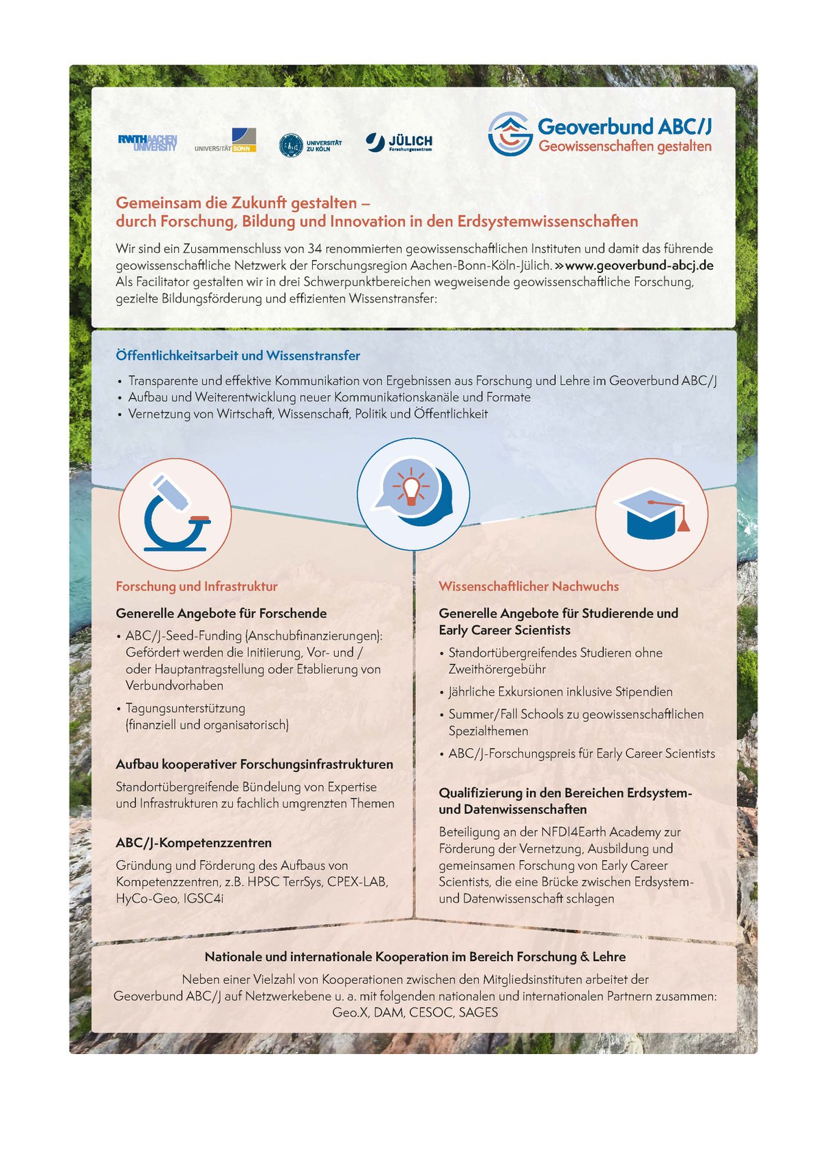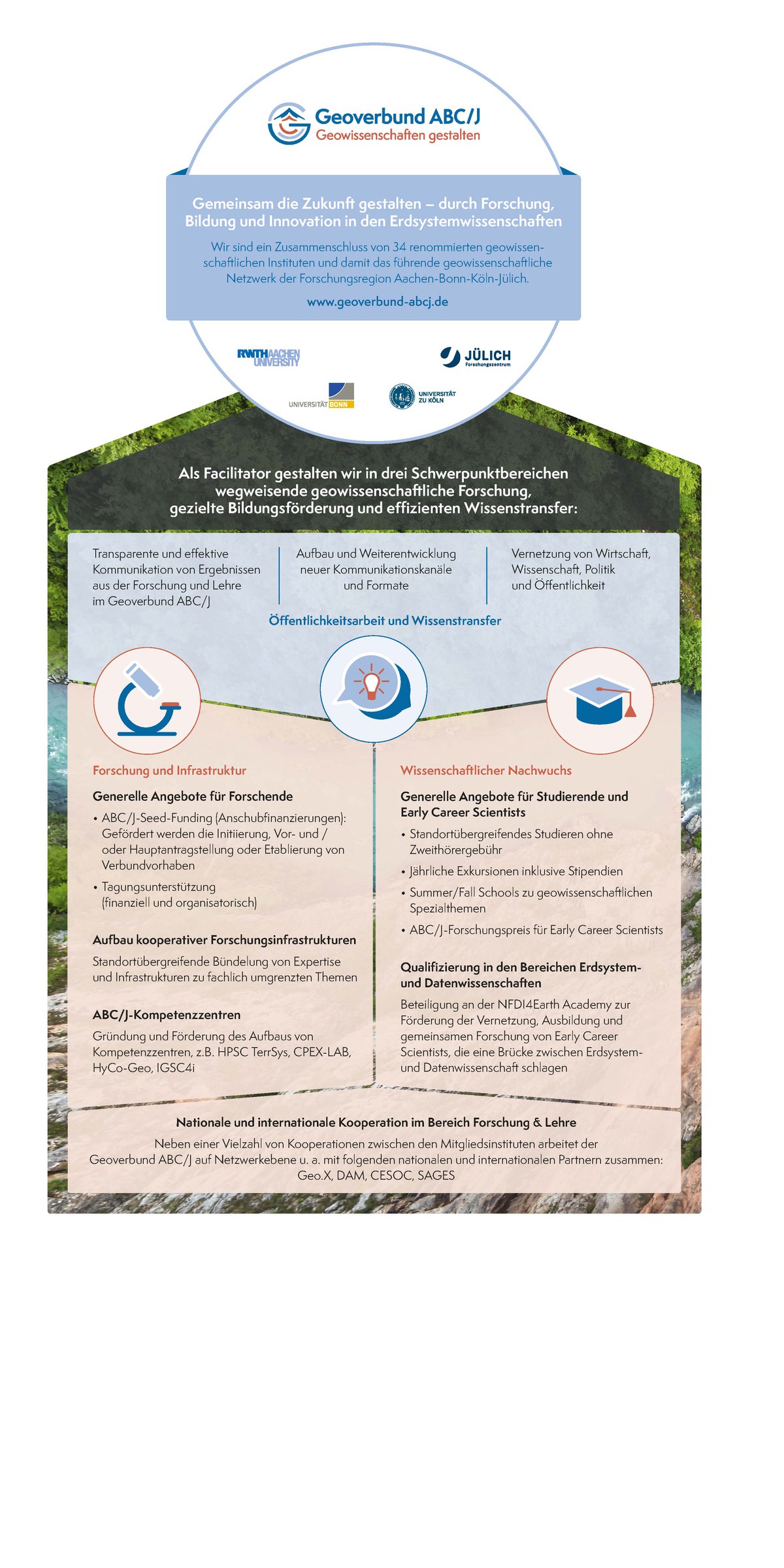 Der Geoverbund ABC/J ist das führende geowissenschaftliche Netzwerk der Forschungsregion Aachen-Bonn-Köln-Jülich. Als Zusammenschluss von 34 renommierten geowissenschaftlichen Instituten der RWTH Aachen, der Universität Bonn, der Universität zu Köln und des Forschungszentrums Jülich treibt er geowissenschaftliche Spitzenforschung voran.