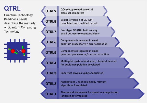 The QTRL scale is a metric for describing the maturity level of quantum computing technology. The scale consists of nine technology readiness levels (QTRLs), whereby QTRL1 labels the lowest level and QTRL9 the highest.