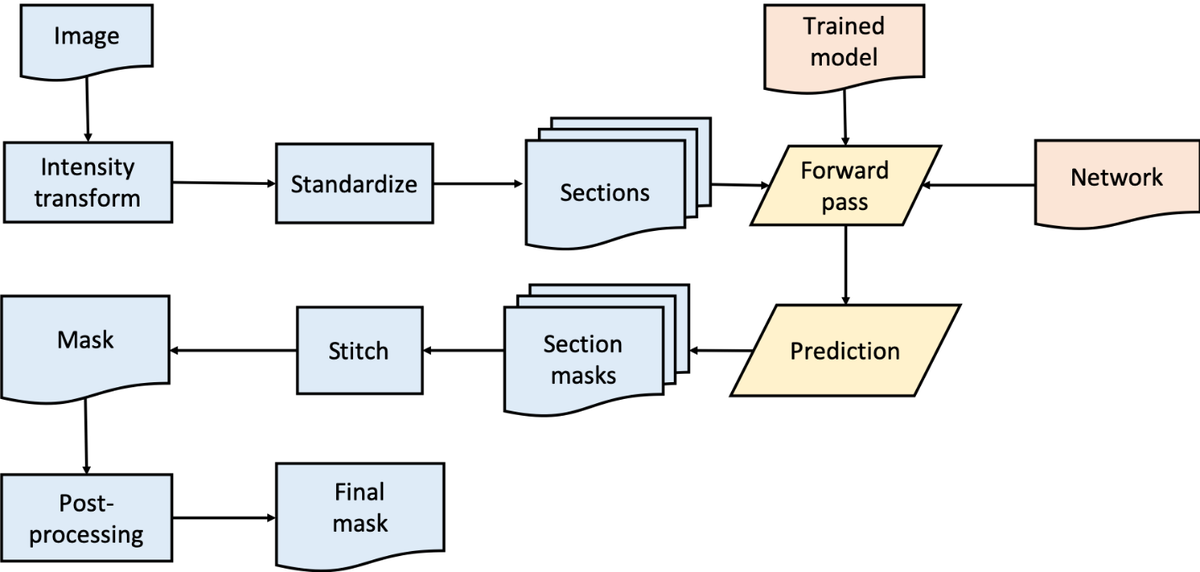 Distributed training on multiple GPUs across multiple nodes on supercomputers is used to speed-up the develop-evaluate-improve cycle. The process of inference for the production environment is presented in Figure 3.