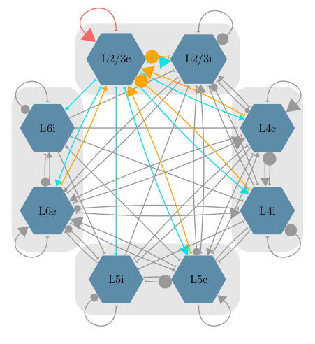 Figure 1: Visualization of a cortical microcircuit model using NeuroScheme and the ViCoGen connectivity framework. Extracted from [3].