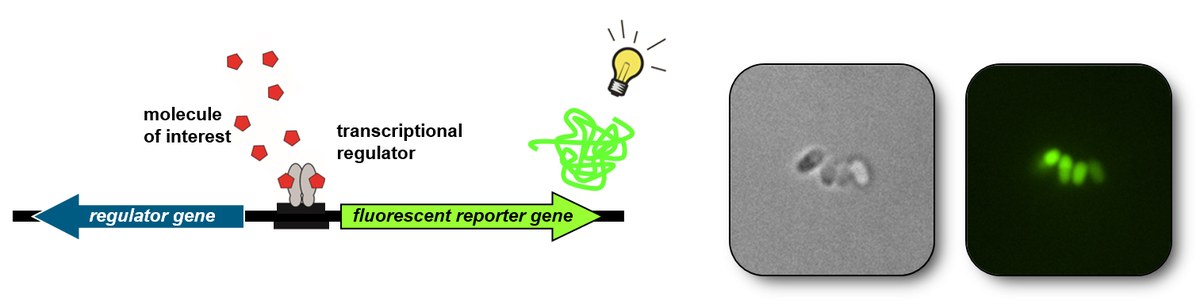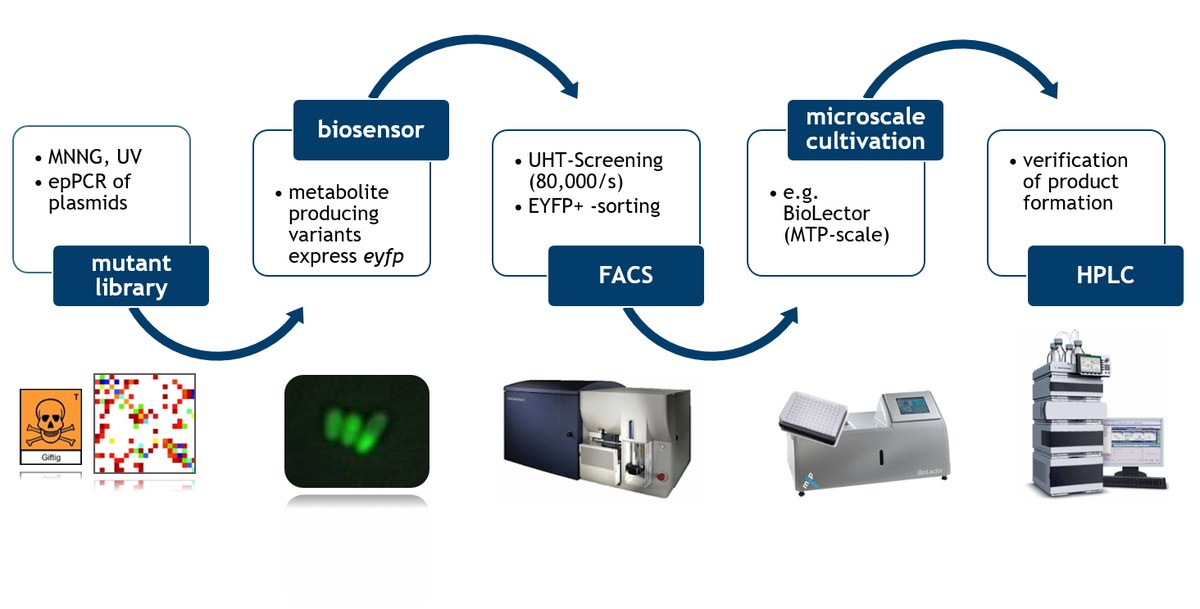 Efforts in the field of metabolic engineering are currently defined by the implementation of a series of rational design-based strategies to modify the host genome and pathway enzymes to achieve moderate product titers. To generate microbial production strains with higher productivities, we want to follow the long trail of successes in protein engineering and develop approaches to high-throughput screening of single cells. For this purpose, we design, construct and apply transcriptional regulators sensing molecules of biotechnological interest, which, in response to this signal, drive transcription of a fluorescent protein [1]. Furthermore, we adapt important biosensor parameters such as specificity, sensitivity and transferability to other microbial hosts [2 - 4].
