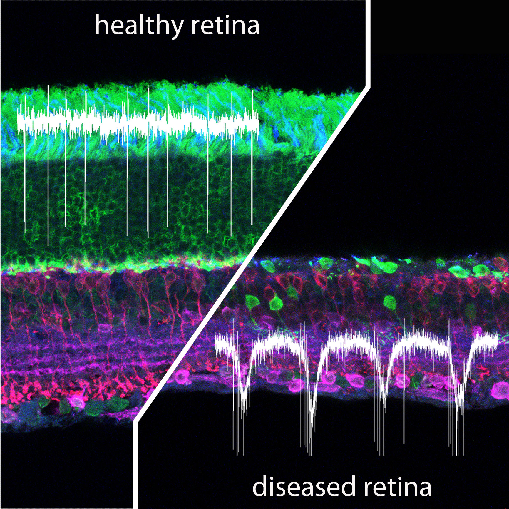 In the human disease retinitis pigmentosa the photoreceptors degenerate, leading to blindness.