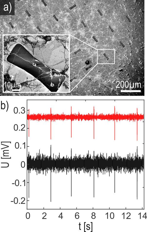 SEM images of the GFET chips after neuronal culture (a) as well as a typical recording from cardiac cells (b).