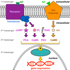 Signaling molecules (neurotransmitters) are released by a neuron (the presynaptic one) to bind the receptors of another neuron (the postsynapic one). This process is one of the key events underlying neuronal communication. It consists of a series of chemical reactions that are initiated by a stimulus (first messenger), acting on a receptor that is transduced to the cell interior through second messengers (which amplify the initial signal) and ultimately to effector molecules, resulting in a cell response to the initial stimulus. This downstream chemical activity leads to diverse biological responses, from gene expression to synaptogenesis. At each step of the signal cascade, a variety of proteins are involved, as well as various controlling factors. A large number of signaling cascades are governed by G-Protein Coupled Receptors (GPCRs). These are key targets for therapeutic intervention as well as for neuroimaging in the diagnosis of the disease. Neuronal GPCRs are also key proteins for human senses, including olfaction, bitter taste and vision.