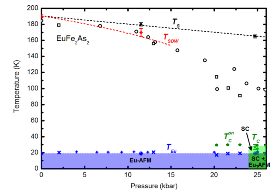 Magnetic phase diagram for EuFeAs2 under hydrostatic pressure. The transition temperatures, TC and TEu, are the superconducting and Eu antiferromagnetic ordering temperatures, respectively. TS and TSDW denote structural phase transition and Fe SDW ordering temperatures, respectively.