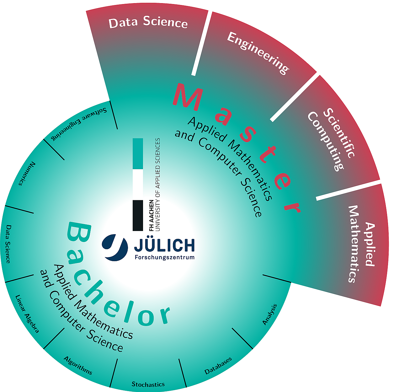 The division consists of three algorithms, tools and methods laboratories (ATML), a research group (RG) and the education team. The AMTLs on “Numerical and statistical methods”, “Advanced time integrators”, and “Concurrency and Parallelism” deal with mathematical modelling, the development and improvement of numerical algorithms as well as their cutting-edge implementation and optimization on HPC systems. The RG “Research Software Engineering for HPC” works on software engineering principles for HPC codes (with a strong focus on mathematical software) and is at the heart of the Jülich-wide JuRSE Community of Practice. The education team is responsible for the organization and realization of the IHK apprenticeship "Mathematisch-Technische/r Softwareentwickler/in" (MaTSE) in combination with the integrated Bachelor's degree program "Angewandte Mathematik und Informatik" (AMI) at Fachhochschule Aachen Campus Jülich (FH Aachen). Together with FH Aachen, the division also conducts the consecutive AMI Master's course.