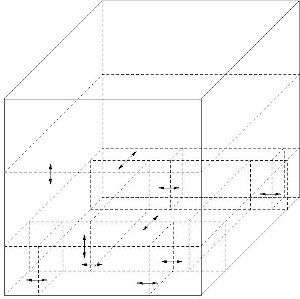 For the geometric load-balancing there are two possible ways, that can be pursued, local and global adjustment. When using local adjustments, only information of a subset of processes, close to each other in space, are used and the domains of these processes are adjusted depending on local workload differences. This leads to iterative types of load-balancing that are suited to be performed during the runtime of simulations, as the overhead is comperatively small. An example for such a scheme can be seen in the scheme on this page, where in a first step the size of process planes are adjusted, then the size of process columns and finally the size of indiviual domainsare adjusted.
