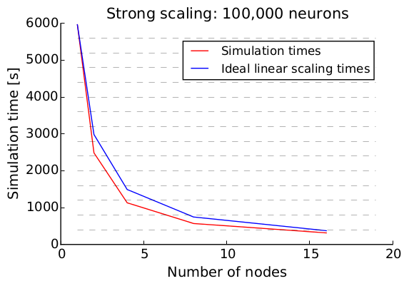 - We have measured the scalability of the framework. As an example, Fig. 2 shows the execution times of a strong scaling test of a network with 100,000 neurons performed on different numbers of computation nodes. Following the NEST philosophy, simulations using structural plasticity can be performed at a small scale on personal computers and at a large scale on supercom