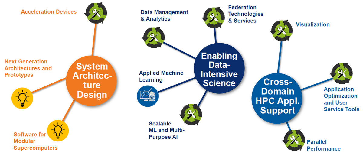 As a cross-domain research area, AI is covered by a wide range of activities in various groups and research domains. The Jülich Supercomputing Centre provides expertise and infrastructure, ranging from the collection of new data for AI model training, the training itself, and the research into novel AI methods to the development of a wide range of AI models, including foundation models.
