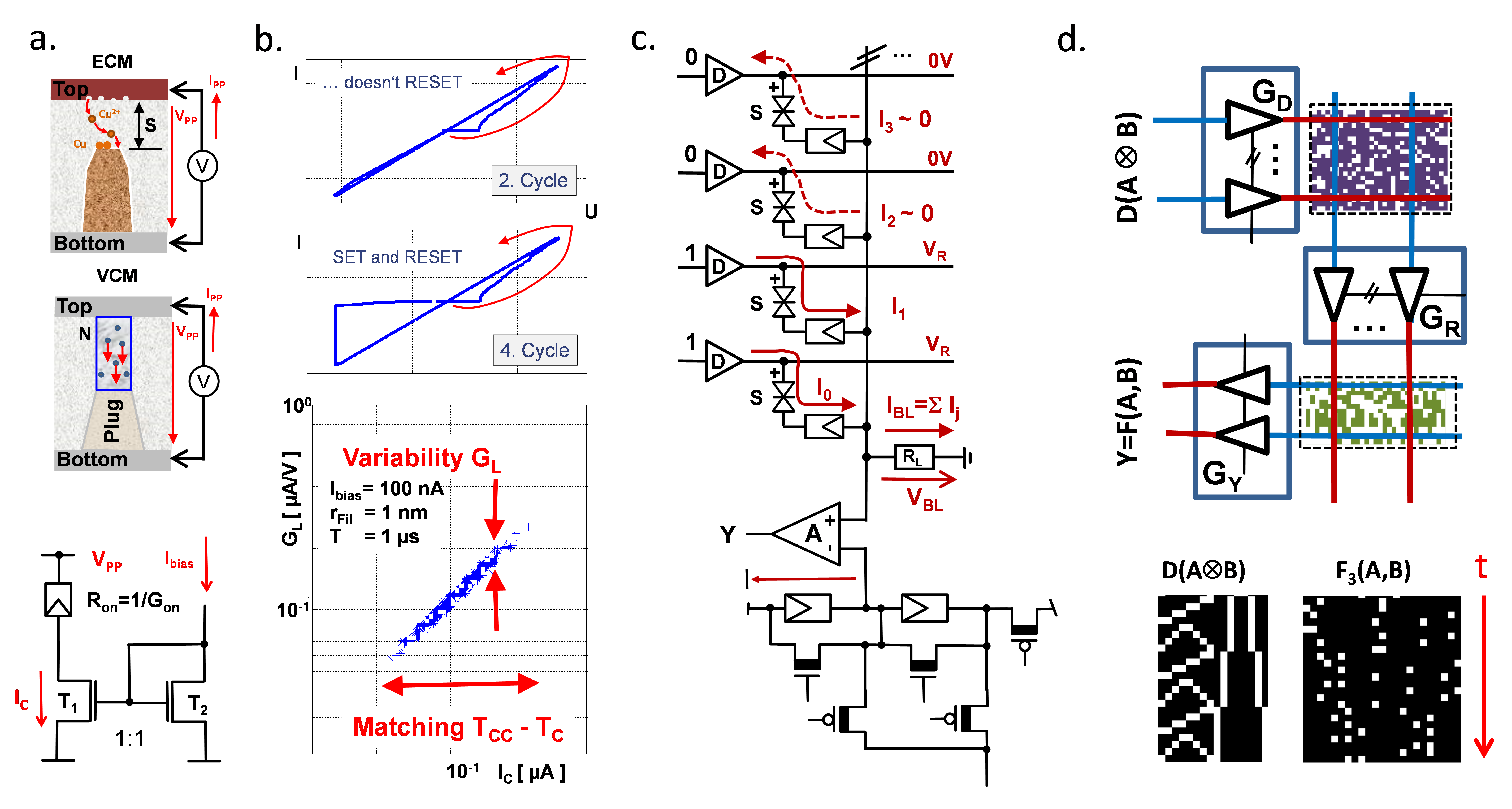 (a) Nano-scaled resistive switches and CMOS devices; (b) variability of switching kinetics; (c) detailed modeling of fundamental circuits with high fan-in; (d) realization of complex logic functions by dense interconnect patterns, associative mapping of sparse activity codes
