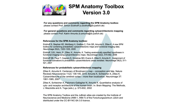 The JuBrain Anatomy Toolbox (a.k.a. SPM Anatomy Toolbox) is an SPM plugin with probabilistic cytoarchitectonic maps for combination with functional neuroimaging data.